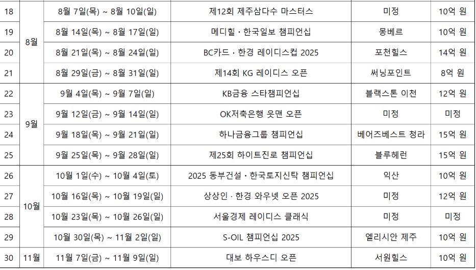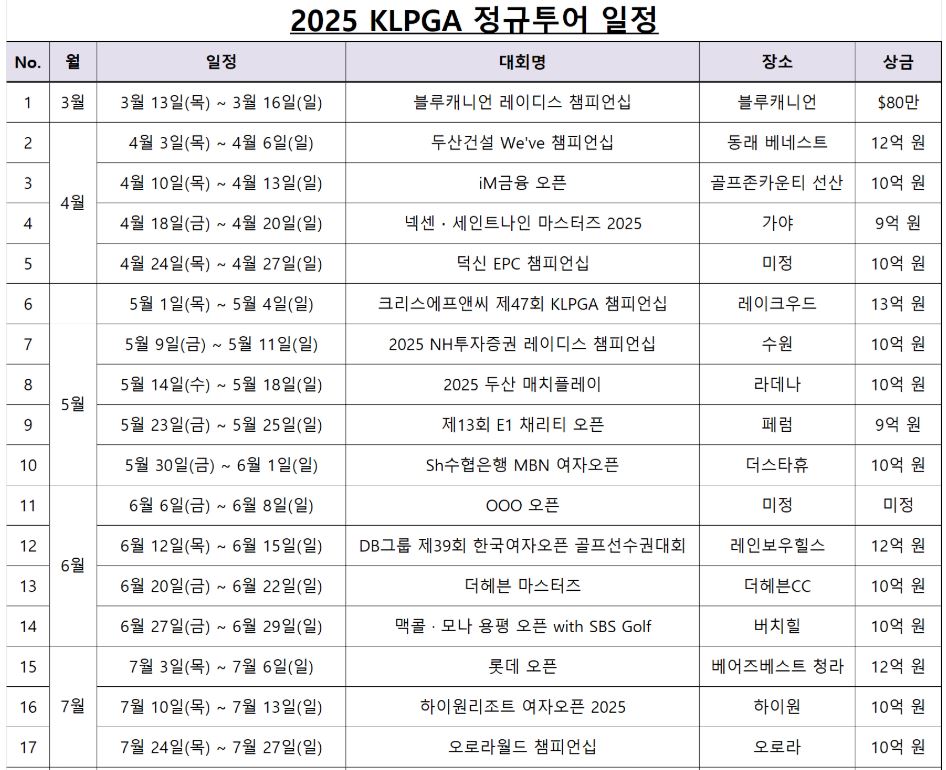 한국여자프로골프투어(KLPGT)가 2025시즌 KLPGA 정규투어 일정을 발표했습니다. 2025시즌 KLPGA 정규투어는 총 30개 대회에 총상금 약 325억 원, 평균상금 약 10억 8천여만 원의 규모로 펼쳐질 예정입니다.